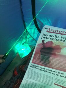Er is een simpele oplossing om die vraag te beantwoorden! Deze lamp laat normaliter alleen een stip zien op de wand waarop geschenen wordt. Maar als er zout in de lucht aanwezig is, dan zie je de hele straal, omdat alle zoutdeeltjes het licht van de laser weerkaatsen.