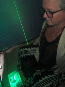 Er is een simpele oplossing om die vraag te beantwoorden! Deze lamp laat normaliter alleen een stip zien op de wand waarop geschenen wordt. Maar als er zout in de lucht aanwezig is, dan zie je de hele straal, omdat alle zoutdeeltjes het licht van de laser weerkaatsen.